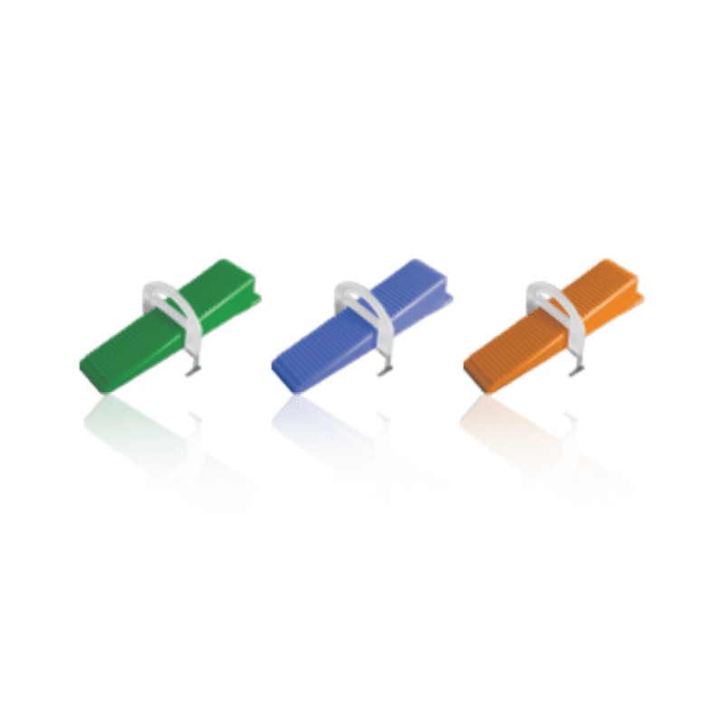 Available Sizes: Clip (50 pcs./pkt.), Wedge (50 pcs./pkt) Demand Quantity (Clip/m² ): Advantages: Specifically angled pliers for use on floor Sturdy steel construction with adjustable tension Tiles are pushed, not lifted, providing better tile adhesion Improves speed of tile laying The most economical tile leveling system